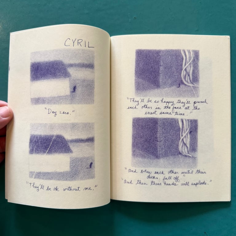 32 pages, approx. 5.25" x 7", one color risograph, saddle stitched. Signed and hand-numbered edition of 300, published by Picturebox, 2005.