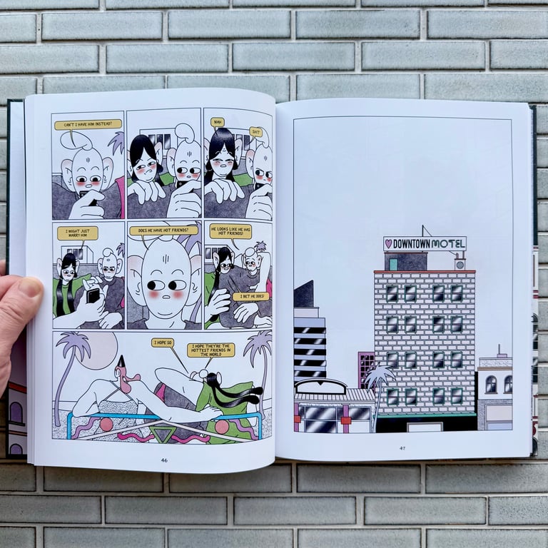 Buff Soul tackles addiction, friendship, and loss in a rollicking road trip adventure involving selling speed, breaking bones, massive hangovers, drug withdrawal, having your entire fist inside your best friend, and shooting guns in the desert. What begins as an insanely comical, hedonistic road trip in the spirit of Pineapple Express, takes a dark turn when her best friend disappears. This event triggers memories of an adolescent trauma she had yet to reckon with, along with fears that history is repeating itself, leading Romanova to confront the reality of how far she’s let her self-destruction go." - Fantagraphics