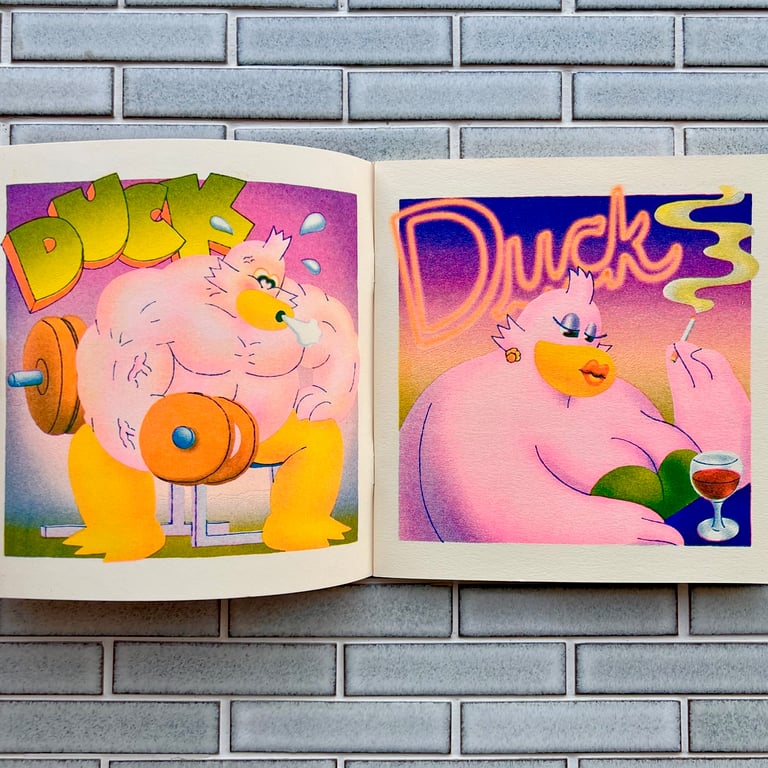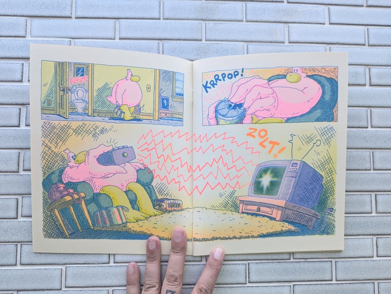 #1: 20 pages, approx. 7" x 7", risograph printed in yellow, fluorescent pink and blue, saddle-stitiched. First edition of 500, published by Hi-Bred in SF, CA.