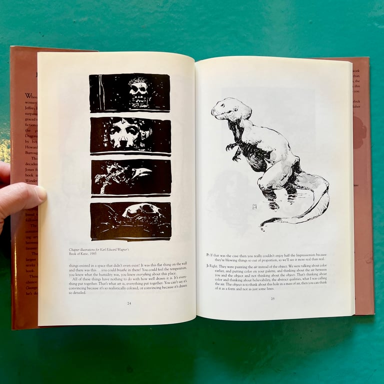 "Beautiful pen and ink sketches by renowned artist Jeffrey Jones, with a sprinkling of his painted work interspersed throughout. Interior is black and white, with rich color dust-jacket. Compiled with the help of George Pratt and David Spurlock, with an intro by Michael Friendlander. Includes a conversation with Jeffrey Jones and George Pratt."