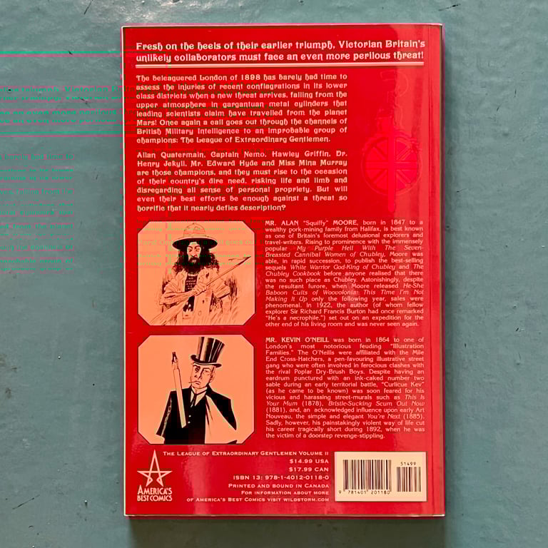 "It's one month after the events in LEAGUE OF EXTRAORDINARY GENTLEMEN VOL. 1, and the skies over England are filled with flaming rockets as Mars launches the first salvo of an invasion. Only our stalwart adventurers — Allan Quatermain, Mina Harker, Captain Nemo, Hawley Griffin, and Mr. Edward Hyde — can save mother England and the very Earth itself. But there are many startling revelations along the way, including the blossoming of love and the uncovering of a traitor in their midst!"
