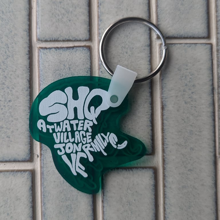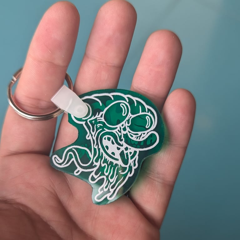 Double sided, see-thru slime green keychains designed by cartoonist Jon Vermilyea!
