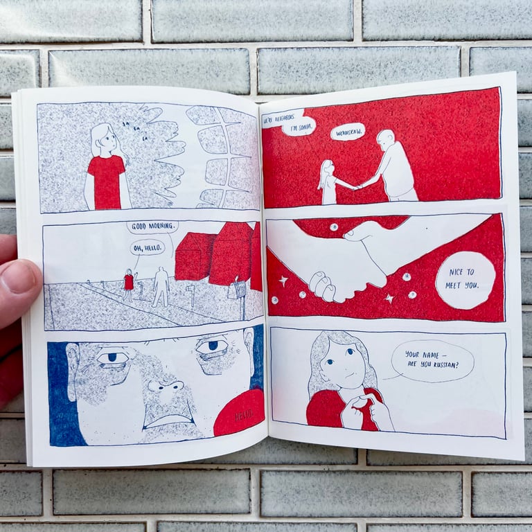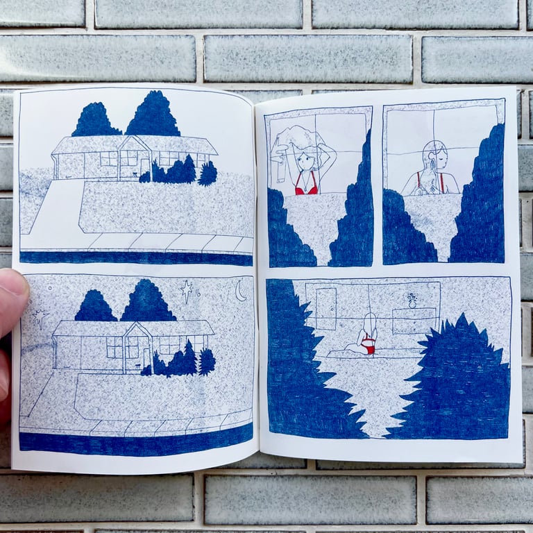80 pages, approx. 4.5" x 6", risograph-printed in federal blue and scarlet, saddle-stitched. Second printing of 500, published by Frog Farm, July 2025 (First Printing, August 2024).