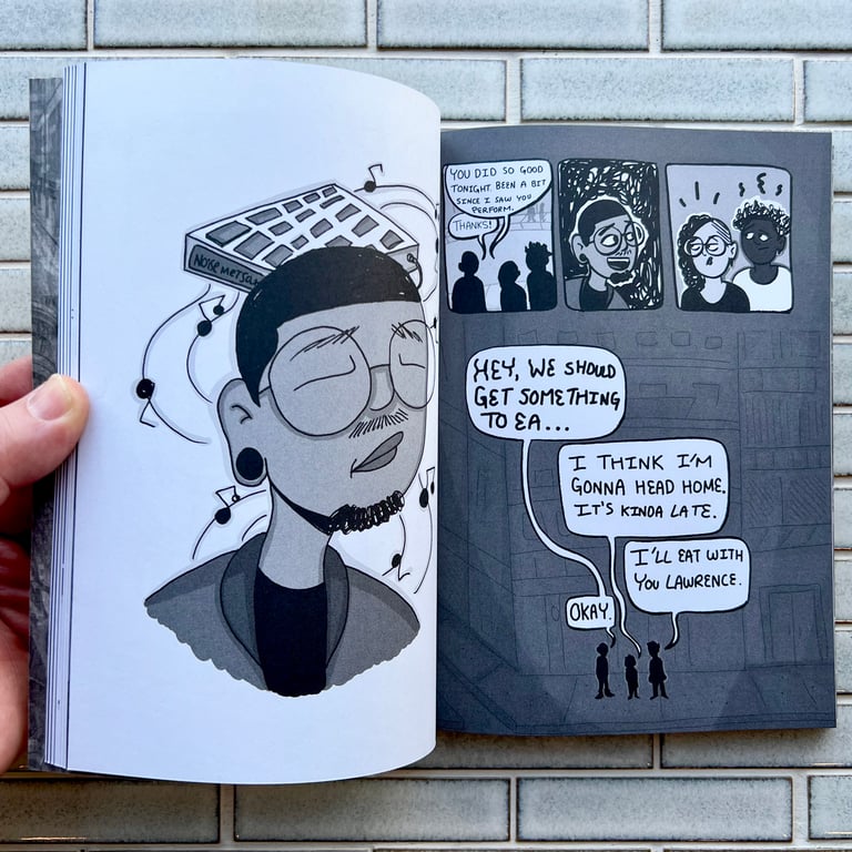 "After a rocky attempt at living in London with his partner, Lawrence finds himself single, broke, and back at home in Compton with his mom and great-aunt, moping from bed to kitchen table and back to bed again, with long layovers on the front porch to sit and watch the world pass him by. Everything had been so good—a degree, an animation internship, paid music gigs, the perfect girl. How the heck did Lawrence get knocked so far down, with such little semblance of his former life remaining to hold him together? Well, that’s a long story…